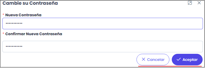 - Al hacer clic en el botón Aceptar, el sistema valida que el campo Nueva Contraseña, cumpla con los parámetros definidos. En caso contrario muestra el respectivo mensaje debajo del campo.