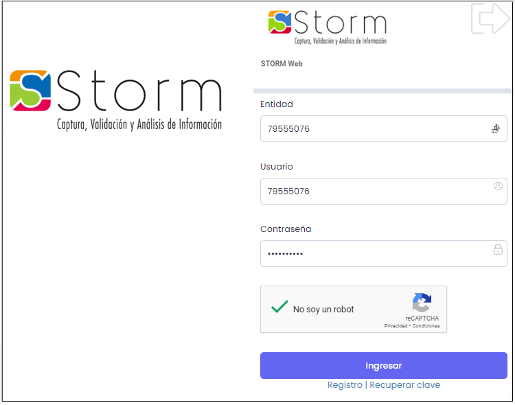 - Entidad: Campo numérico. Ingrese el código asignado al crear la empresa (módulo STORM Monitor).