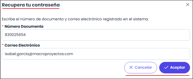 - Al hacer clic sobre el botón Aceptar, el sistema valida que el número de documento y correo ingresado existan en la base de datos y estén asociados. En caso contrario, expone el siguiente mensaje:
