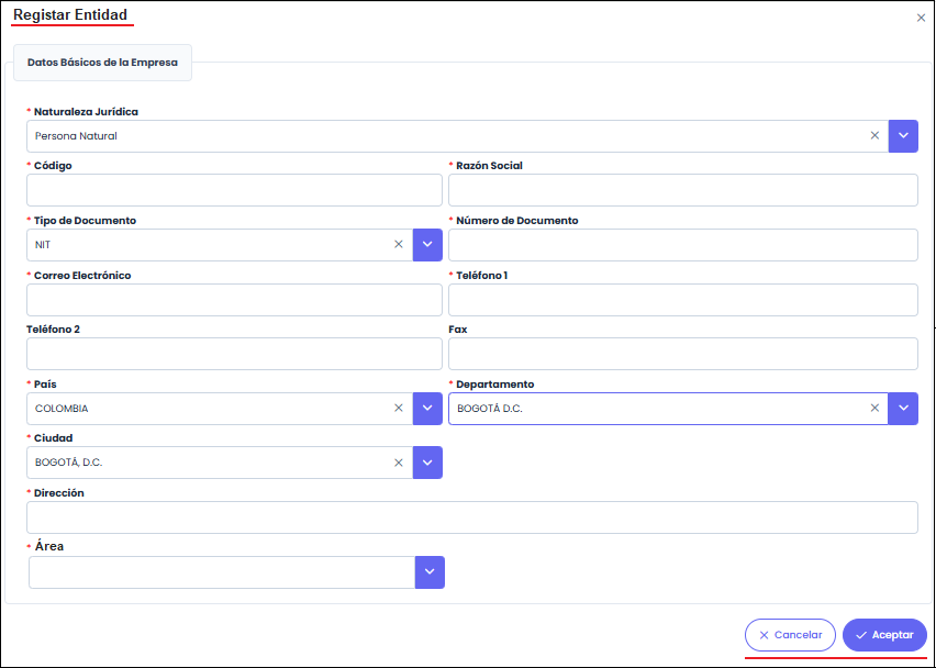 - Naturaleza Jurídica: Campo tipo lista. Corresponde a la naturaleza Jurídica de la empresa. Los valores preestablecidos son: Persona Natural, Persona Jurídica.