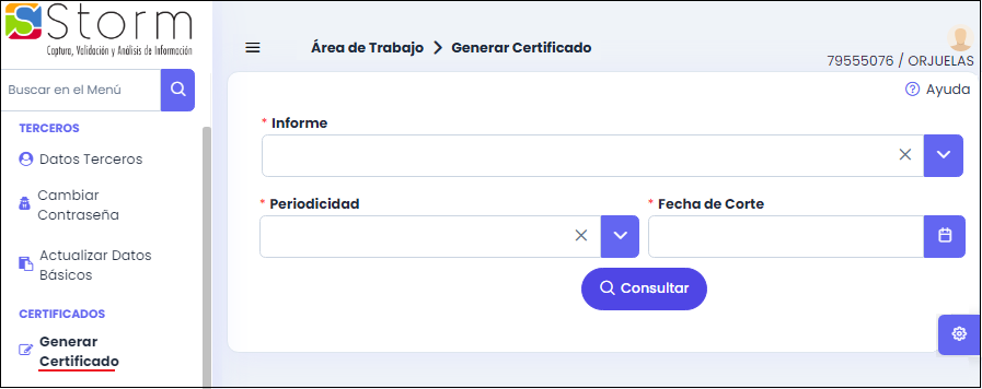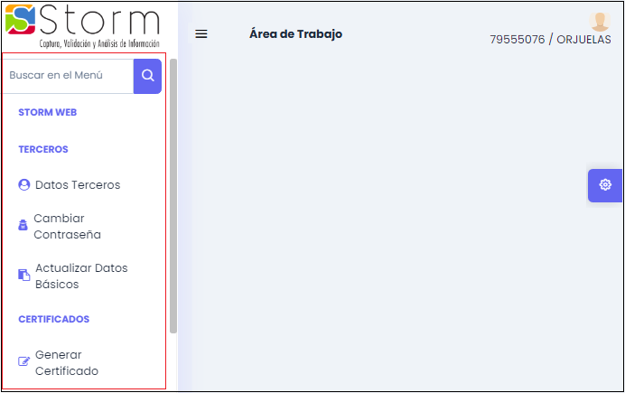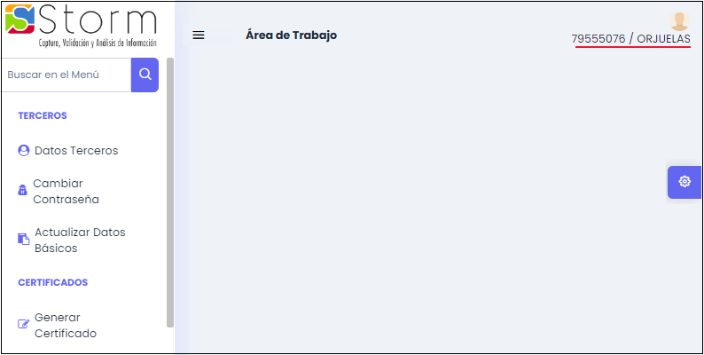 En la parte derecha del área de trabajo, el sistema muestra el código de la entidad y la Razón Social (usuario) con la cual se inició la sesión.