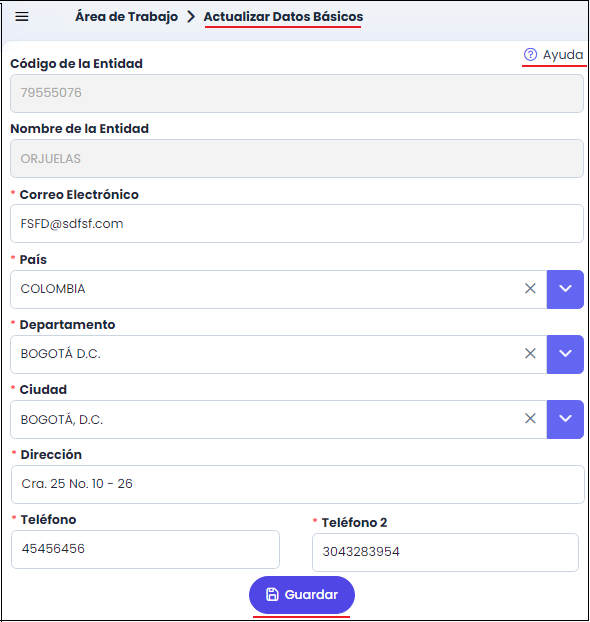 - Código de la entidad: Campo numérico. Precarga el número o código de identificación de la entidad (no editable).