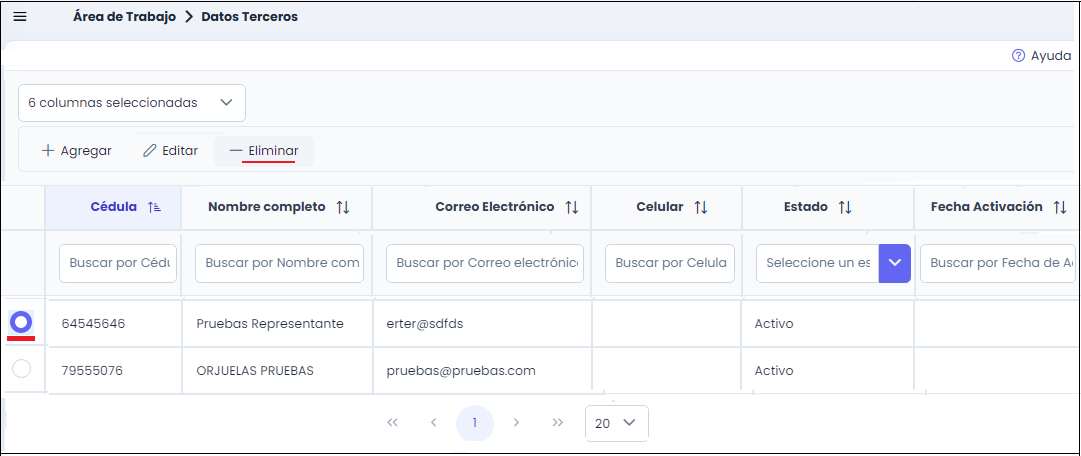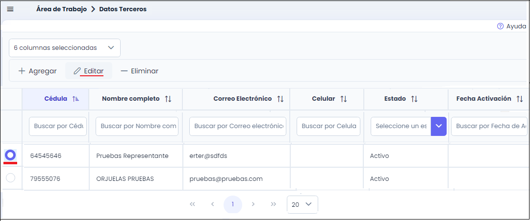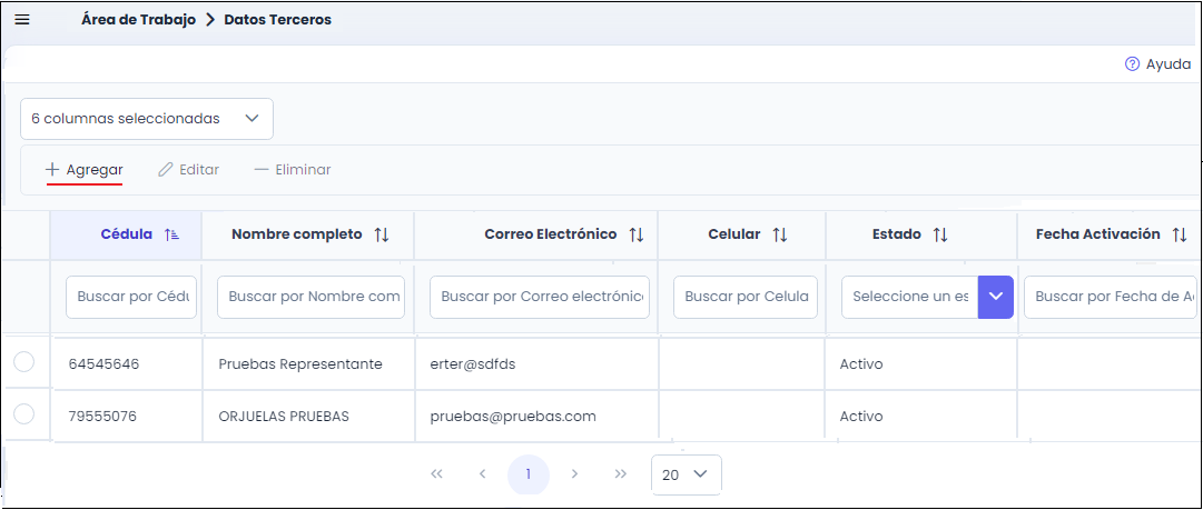 El sistema precarga en la tabla el listado de todos los terceros que se encuentren previamente creados y muestra los siguientes campos: Cédula, Nombre completo, Correo electrónico, Celular, Estado y Fecha Activación. Los campos poseen ordenamiento y filtro de búsqueda.