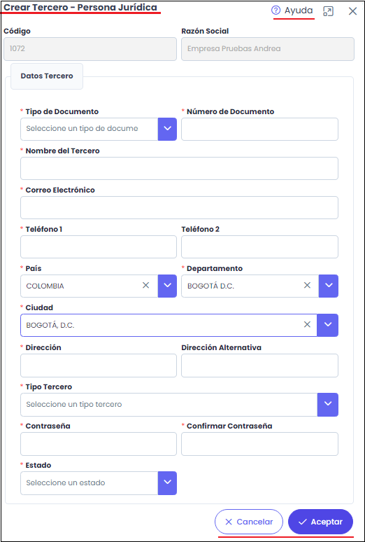 - País: Campo tipo lista - autocompletar. Permite ingresar el país donde se ubica el tercero que se está creando.