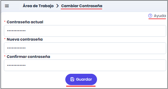 - Contraseña Actual: Campo alfanumérico. Corresponde a la contraseña actual.