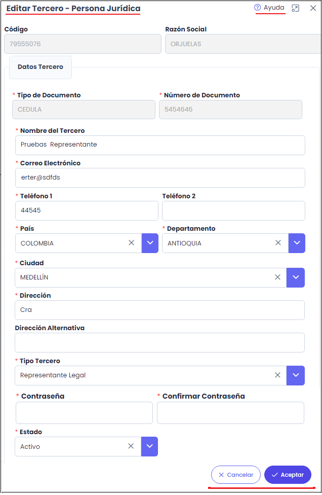 - Estado: Campo tipo lista. Permite ingresar el estado del tercero (Activo/Inactivo).